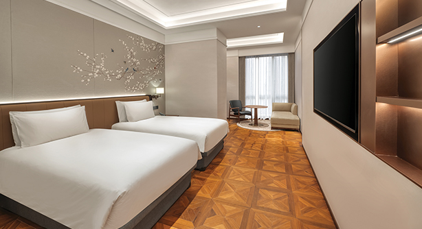 时尚简约的设计风格,搭配温润材质与柔和灯光,营造舒适惬意的居住氛围。客房面积约25–28平方米,位于酒店3–5层别馆楼层,提供大床或双床选择。大床尺寸1.8米 × 2米,双床尺寸1.2米 × 2米。卫生间配备独立淋浴房及智能马桶。房内提供带国际频道的卫星电视、定制设计家具及高速无线网络等设施,满足商务及休闲旅客的多元需求。 别馆大床 / 双床房不可加床。