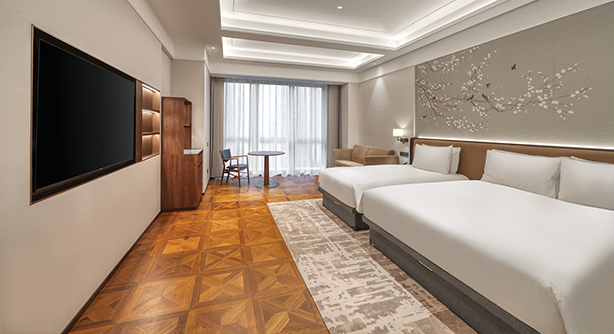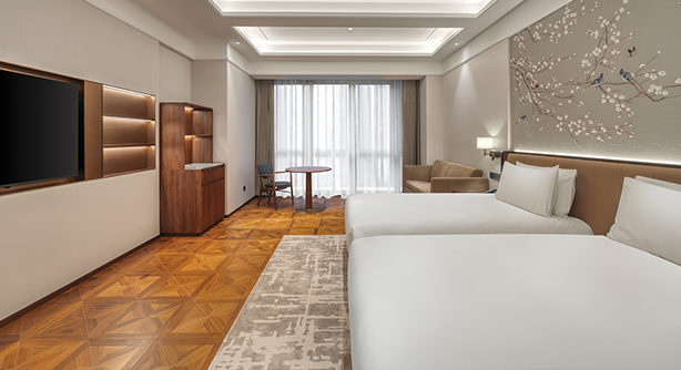 整体空间更为开阔,采用现代雅致的设计语言,营造从容放松的居停体验。客房面积约33–40平方米,位于酒店3–5层别馆楼层,提供大床或双床选择。大床尺寸1.8米 × 2米,双床尺寸1.2米 × 2米。卫生间配备独立淋浴房及智能马桶。房内设有带国际频道的卫星电视、定制家具及高速无线网络,为追求更高舒适度的宾客提供理想选择。