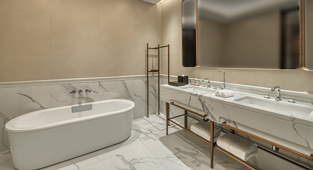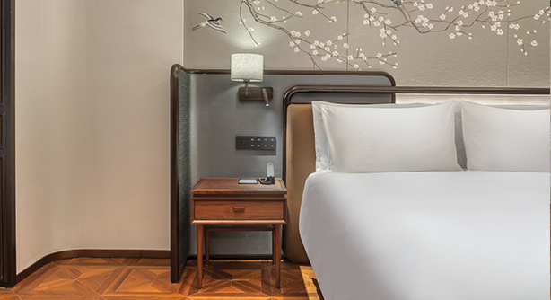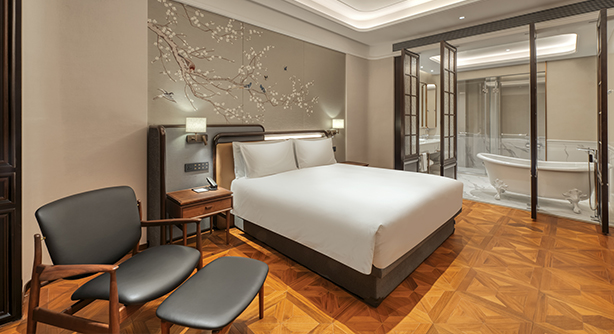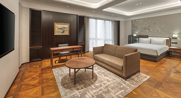 更大尺度的起居空间,融合现代设计与细节质感,打造兼具私密感与舒适度的居停体验。客房面积约50平方米,位于酒店3–5层别馆楼层,大床尺寸2米X 2米。卫生间配备独立淋浴房及智能马桶。房内配备带国际频道的卫星电视、定制设计家具及高速无线网络,适合追求更高品质入住体验的宾客。