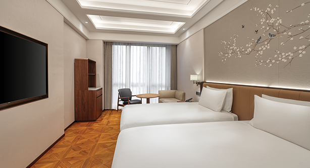 时尚简约的设计风格,搭配温润材质与柔和灯光,营造舒适惬意的居住氛围。客房面积约25–28平方米,位于酒店3–5层别馆楼层,提供大床或双床选择。大床尺寸1.8米 × 2米,双床尺寸1.2米 × 2米。卫生间配备独立淋浴房及智能马桶。房内提供带国际频道的卫星电视、定制设计家具及高速无线网络等设施,满足商务及休闲旅客的多元需求。 别馆大床 / 双床房不可加床。