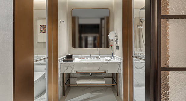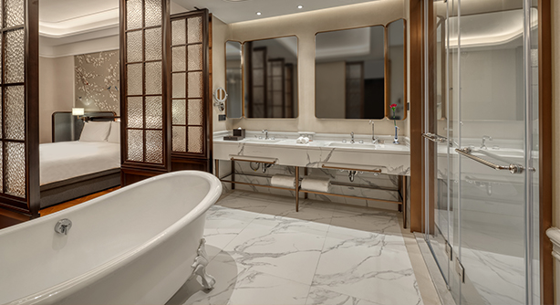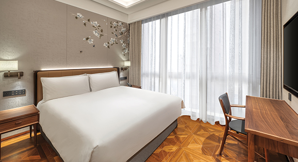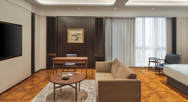 更大尺度的起居空间,融合现代设计与细节质感,打造兼具私密感与舒适度的居停体验。客房面积约50平方米,位于酒店3–5层别馆楼层,大床尺寸2米X 2米。卫生间配备独立淋浴房及智能马桶。房内配备带国际频道的卫星电视、定制设计家具及高速无线网络,适合追求更高品质入住体验的宾客。